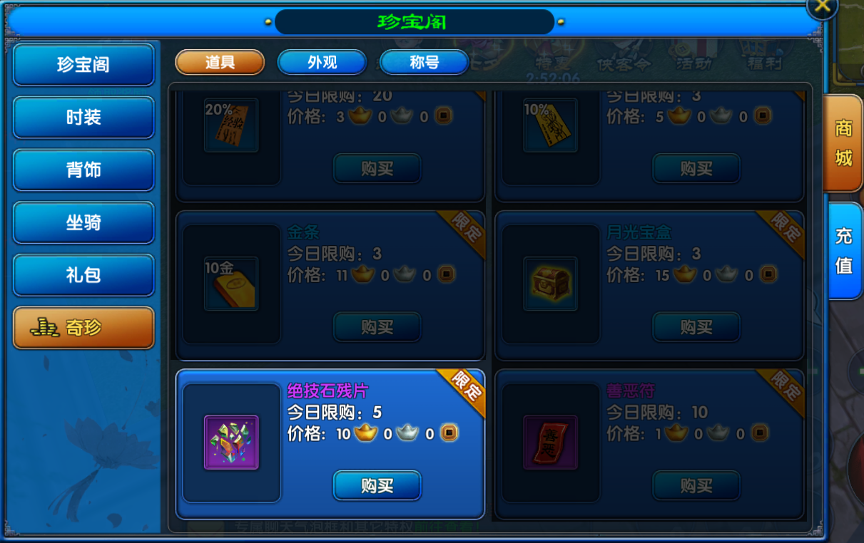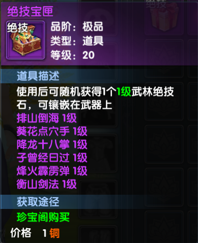 珍宝阁可以购买绝技石碎片,每日限购5个,20个碎片可合成绝技宝匣,打开随机获取一种武林绝技。
