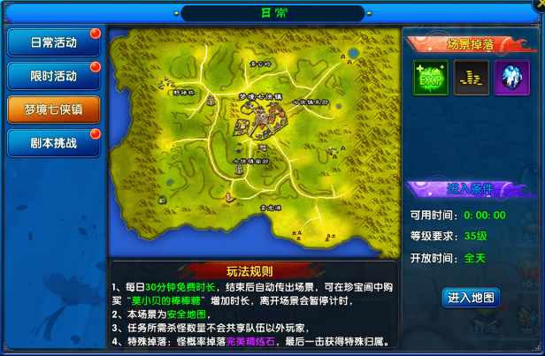 当玩家等级达到35级即可进入场景,每日每名玩家均拥有30分钟的免费时长,免费时长结束后会自动退出场景,如果觉得免费时长不够用,也可在珍宝阁中购买价格为20元宝的“莫小贝的棒棒糖”,每日限购24个,每支增加30分钟,足足拥有12小时的时间,如果中途想退出时间却没用完,也不必担心,离开场景会自动暂停计时。